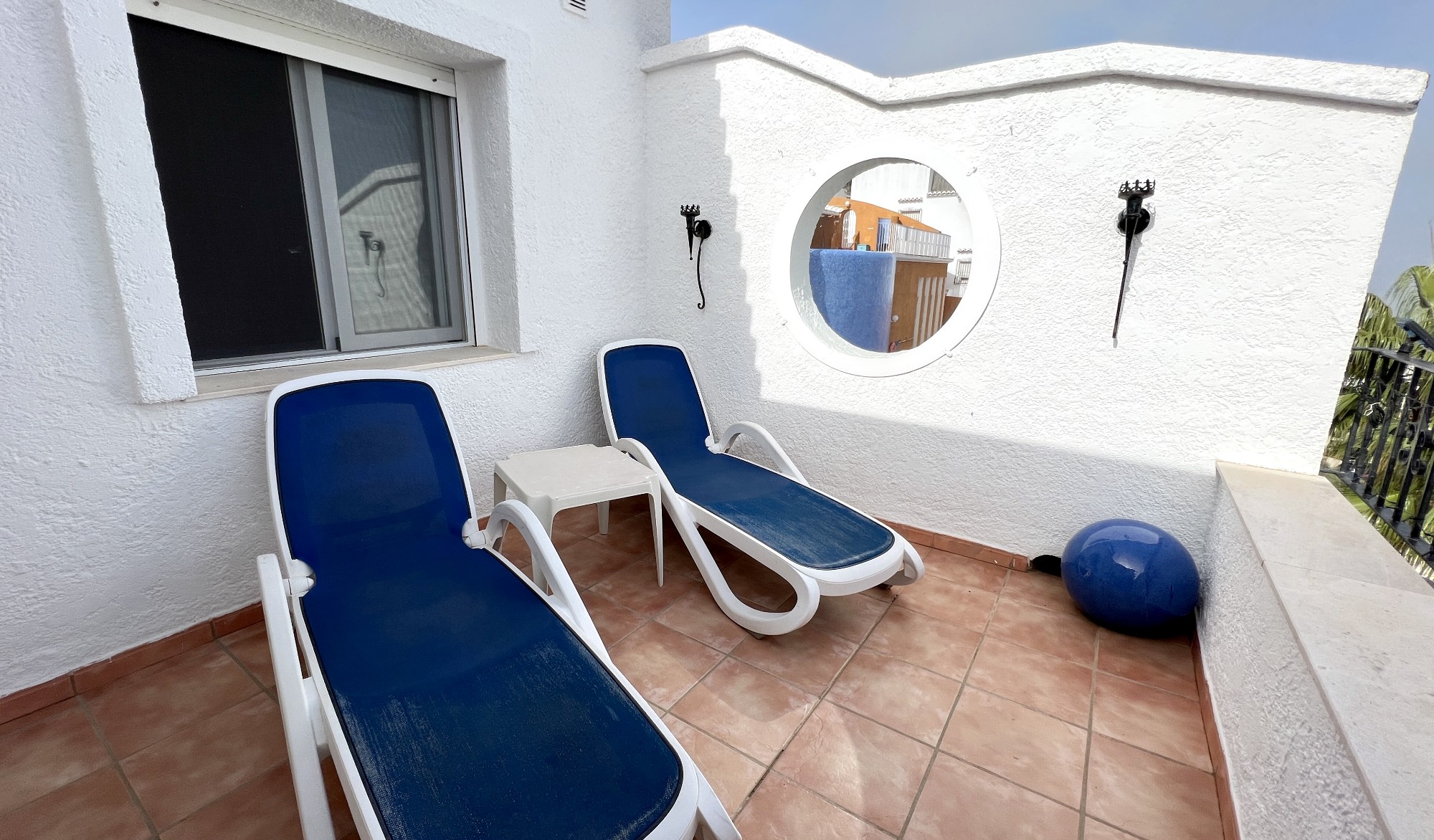 To the left is the open plan kitchen lounge and dining room fitted with hot and cold air-conditioning to ensure comfort during the cooler and warmer days. The modernised kitchen has an island with electric hob and oven on once side and the breakfast bar on the other.On the wall side is the microwave oven and fridge freezer all fitted in grey veneer wall and base units with a white Silestone worktop and magenta backslash. The lounge area feels very light and spacious with the wall to wall and floor to ceiling glass sliding doors onto the balcony. The 20 metre sq balcony is split into two areas one with glass roof withawning for protection from the sun, windows and a side awning for those sunny winter days to create a lovely and warm space to sit and look out to seawith a glass of wine.