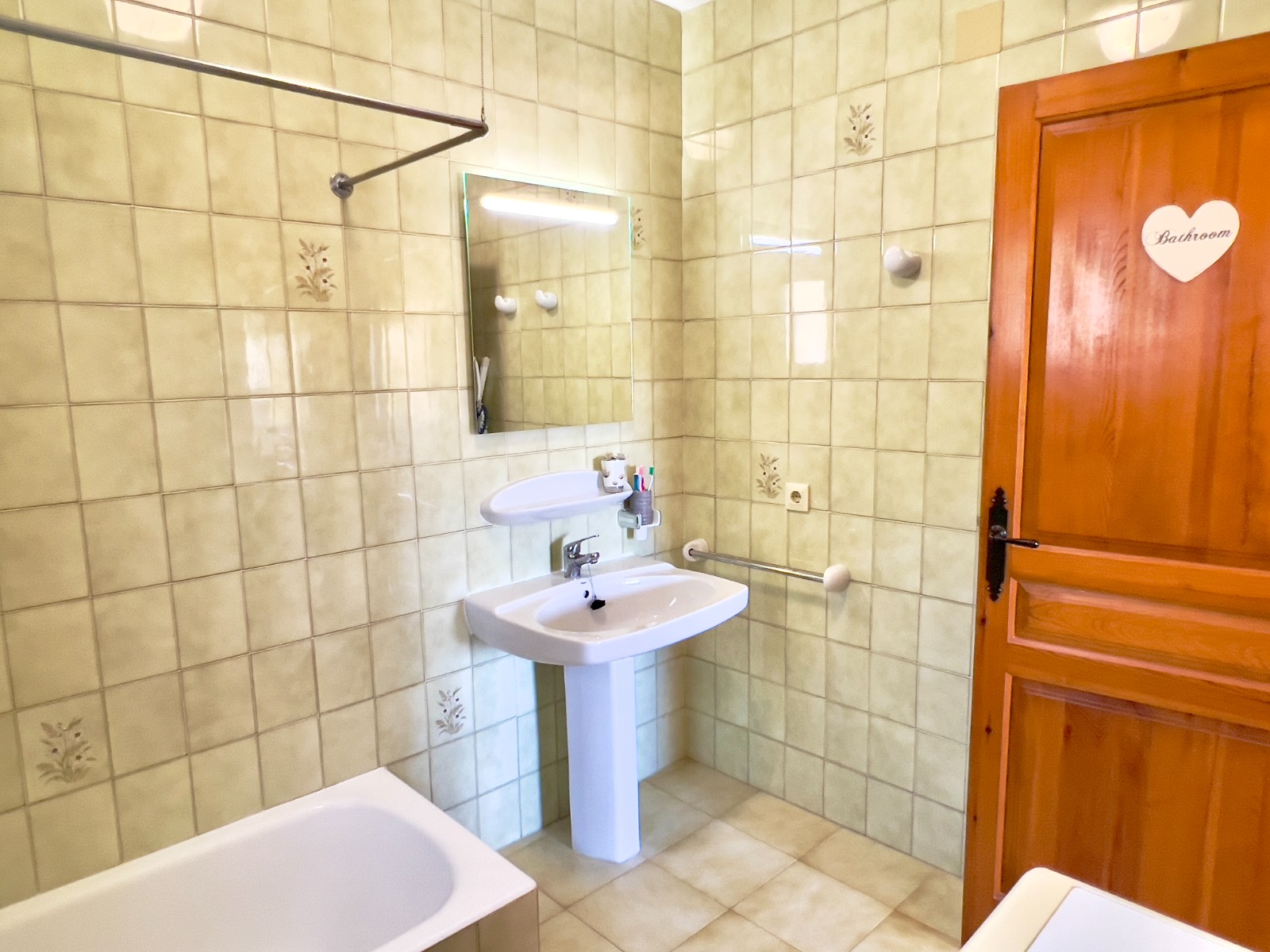 Opposite the bedrooms is the family bathroom, which includes a shower over a full-sized bath, a free-standing basin, and a washing machine. Both bathrooms feature original ornate Spanish tiling. Throughout the apartment you will find PVC double-glazed windows with blinds, mosquito nets, and rejas for added security.