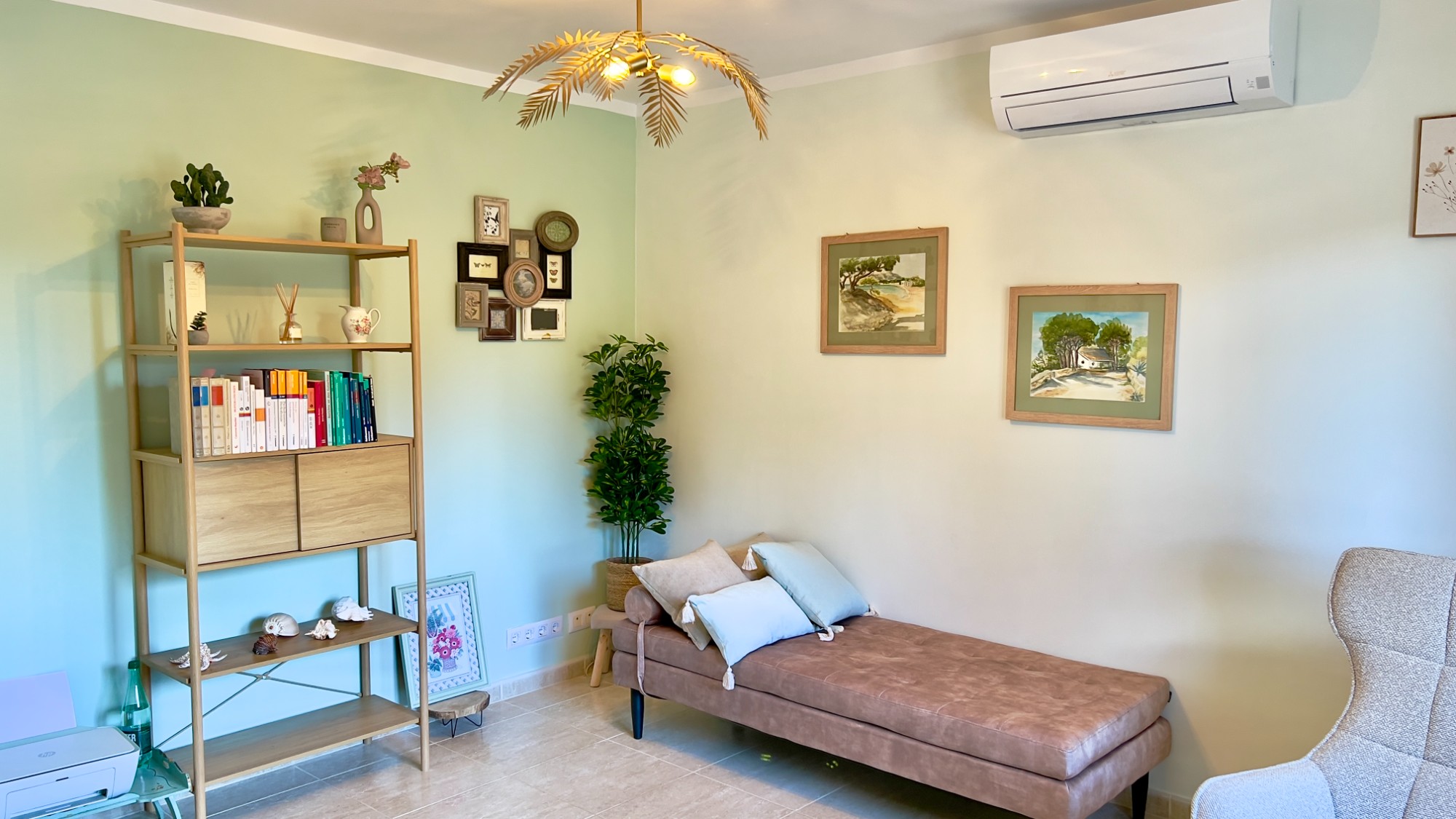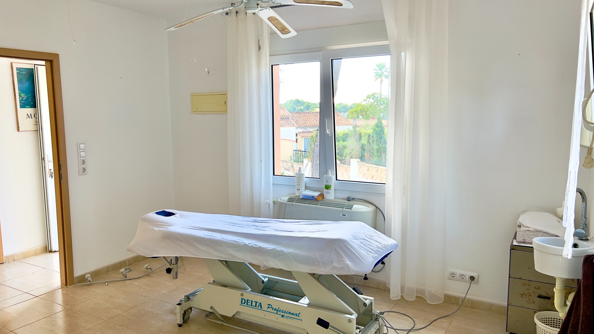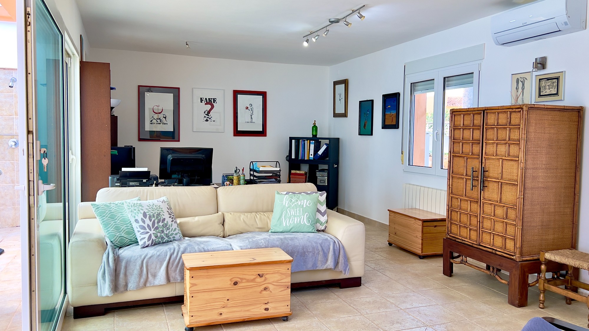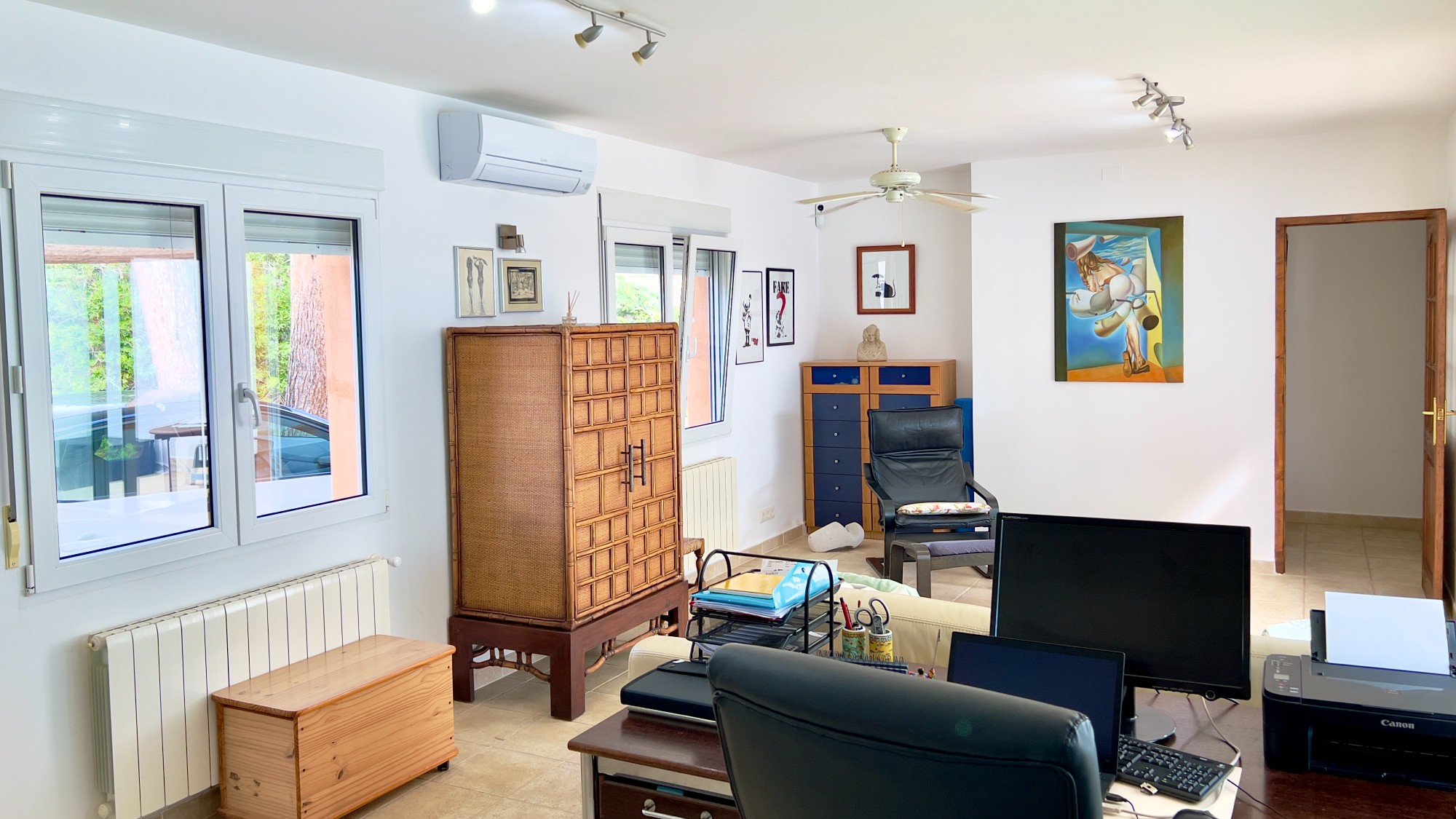 A step down from the hallway leads into the extension rooms (awaiting registration) with a shower room featuring a dual rain shower and freestanding basin. From here, a door opens into a large living space currently used as an office and sitting room, which could easily become a fifth bedroom or master suite. This room also has hot and cold air-conditioning and double French doors leading out to the swimming pool and terrace.