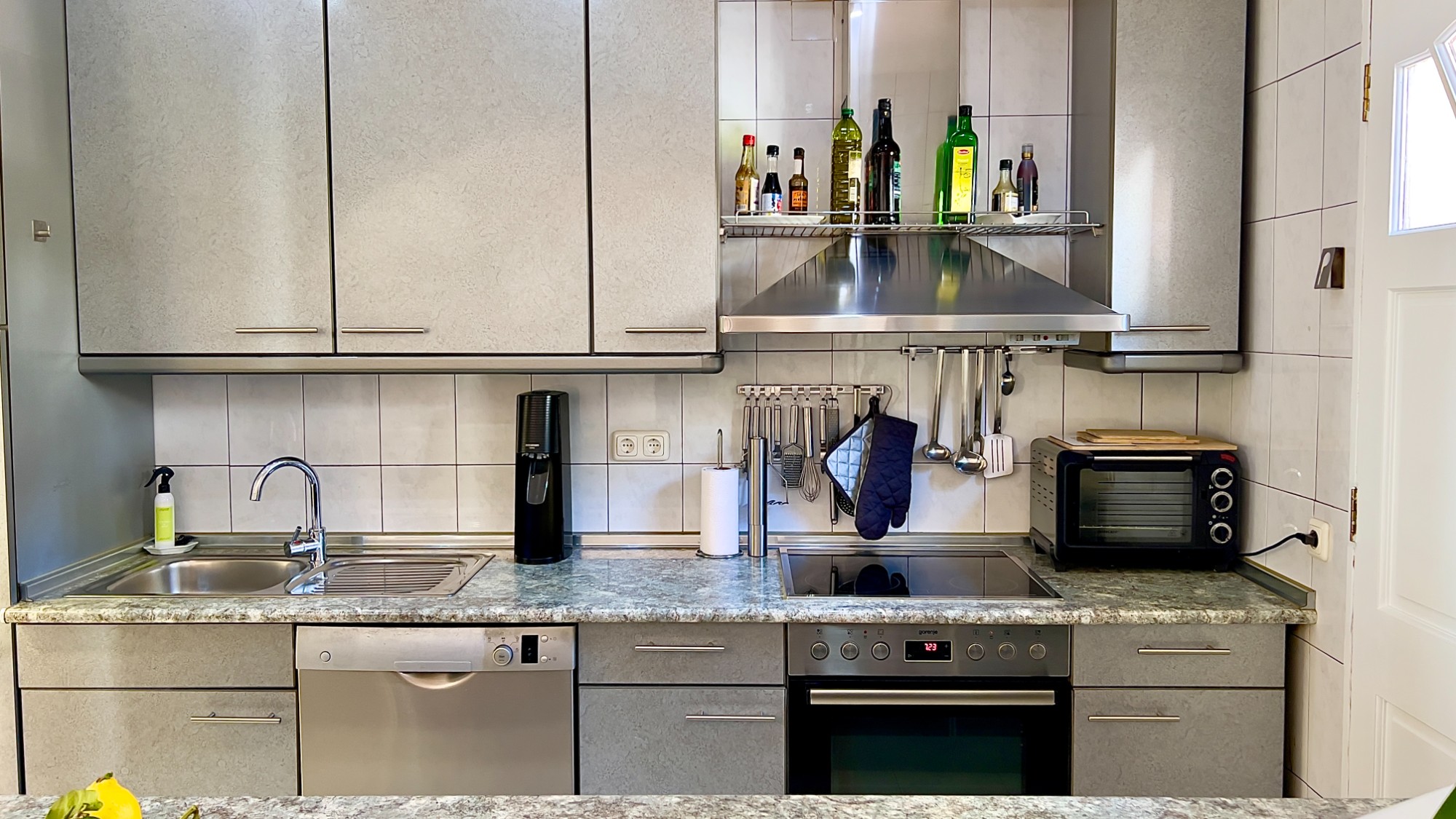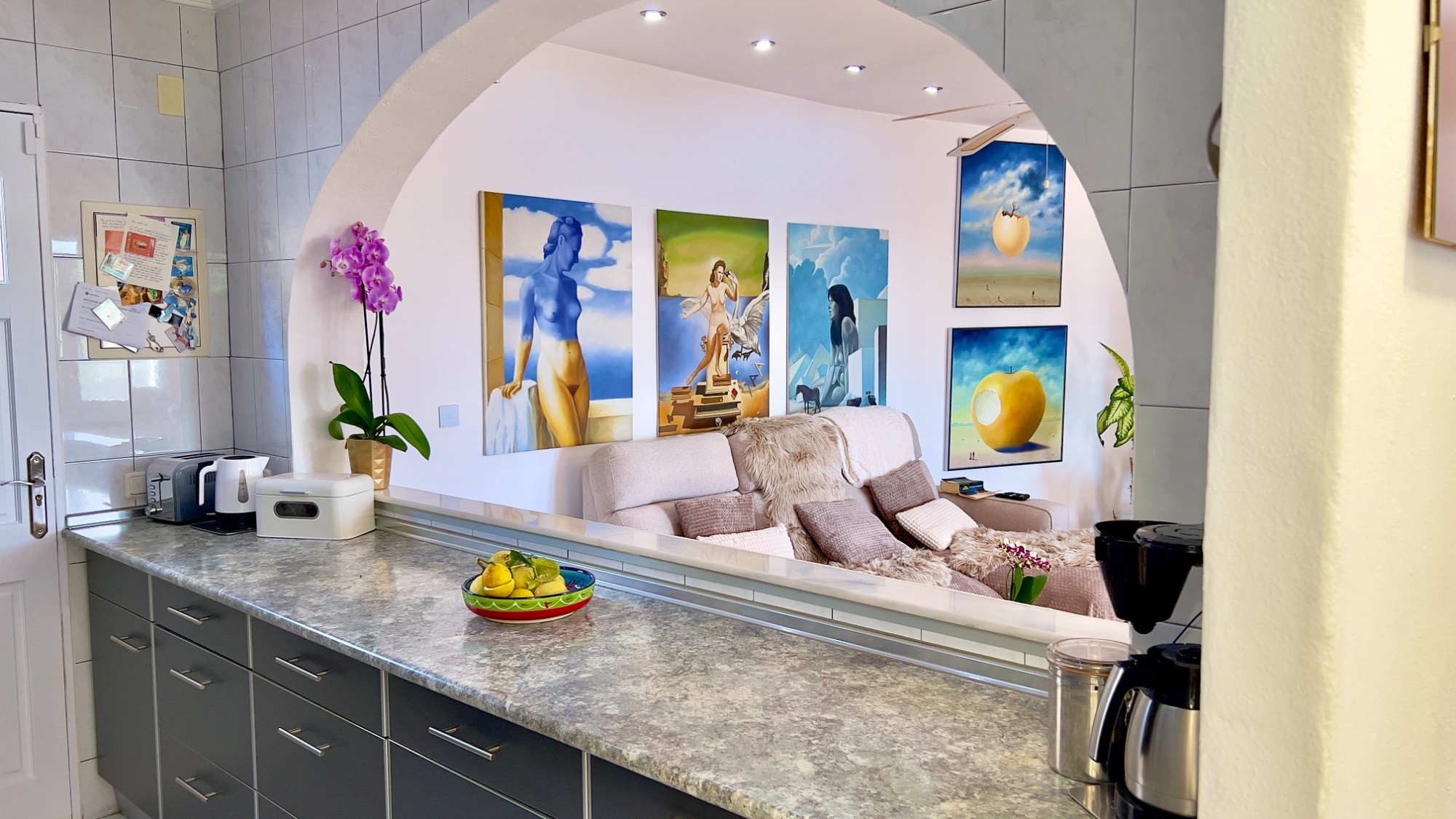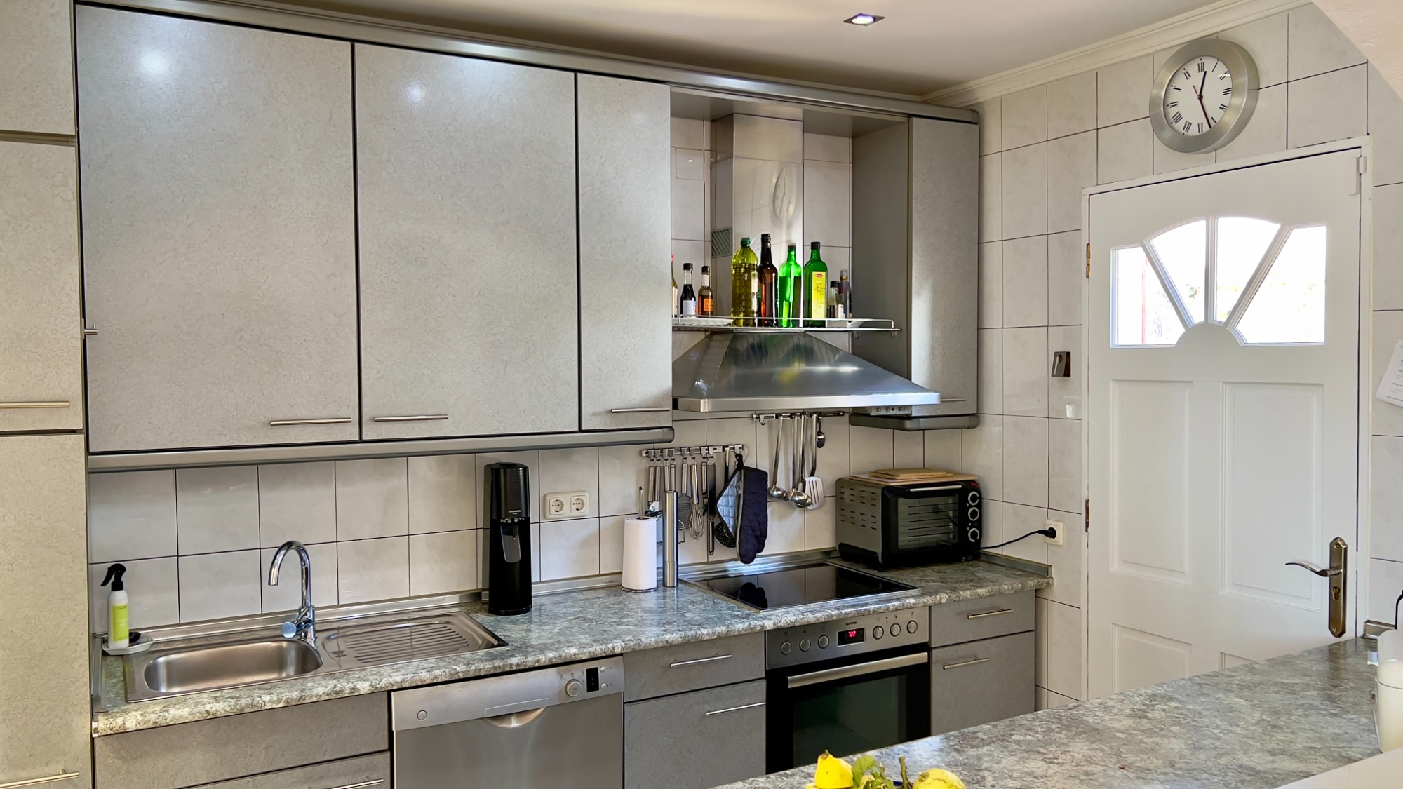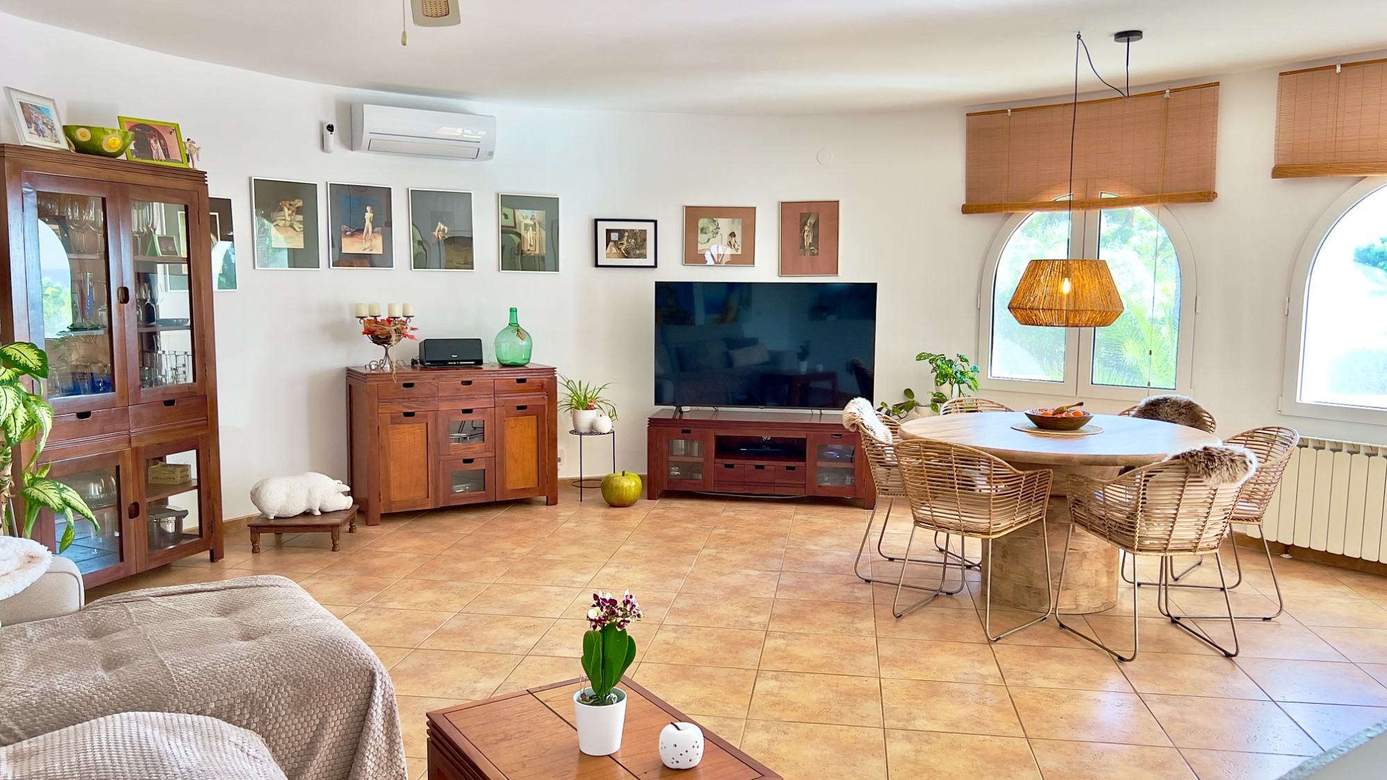 Entering the house through a reja door, you arrive in the kitchen, which is open to the living and dining area. The kitchen is fitted with an electric hob and oven, dishwasher and built-in fridge-freezer, with granite worktops and ample storage in wall and base units. A wide archway connects it to the lounge and dining room, creating a practical and sociable space for entertaining.