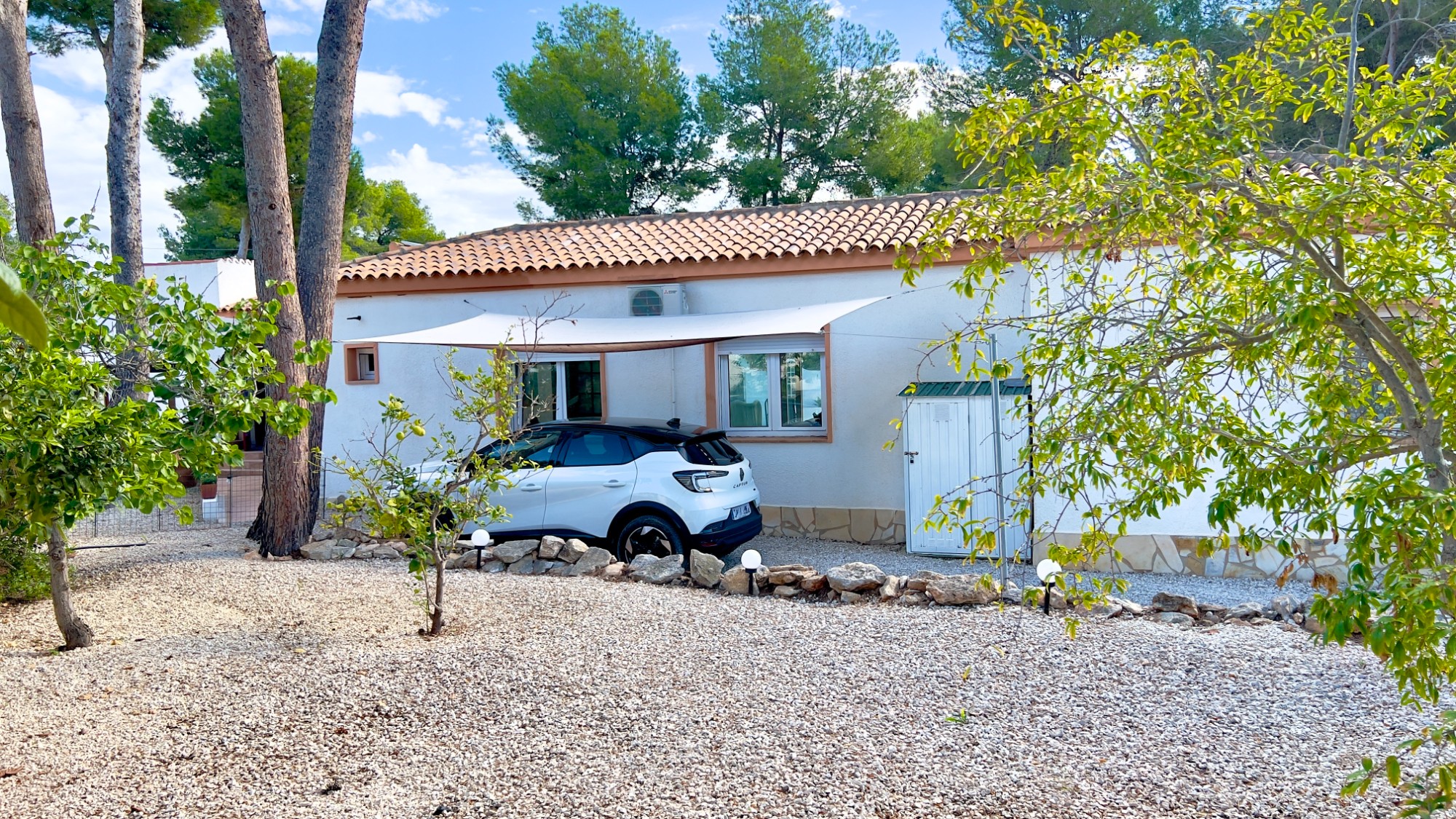 A manual gate opens onto a large wraparound gravel driveway with ample parking for several cars, a trailer or even a boat. Directly in front is an extension with entrance columns and wheelchair access. It is currently used as a home clinic and comprises two rooms, one with electric heating and ceiling fan, and the other with hot and cold air-conditioning, plus a small guest toilet. This area is awaiting registration and is likely to be classified as two bedrooms with a toilet, making it ideal for visiting family or guests, or to continue as a clinic or home office with a separate entrance.