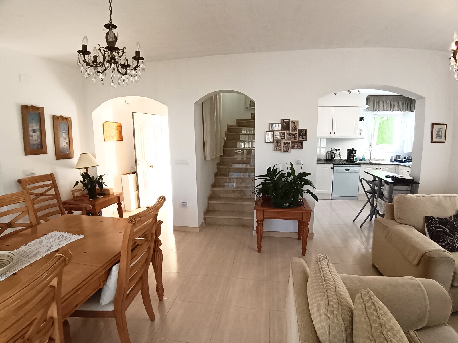 Inside, the ground floor opens with a generous entrance hall that leads into a bright open plan living and kitchen area. The lounge-dining room has a fireplace and hot and cold air conditioning for year-round comfort. The adjoining kitchen is fully equipped with an electric hob and oven, built-in dishwasher, fridge-freezer and ample storage within white wooden cabinetry. Large sliding doors connect the interior to a covered terrace that overlooks the garden and offers a pleasant, shaded space for al-fresco dining.