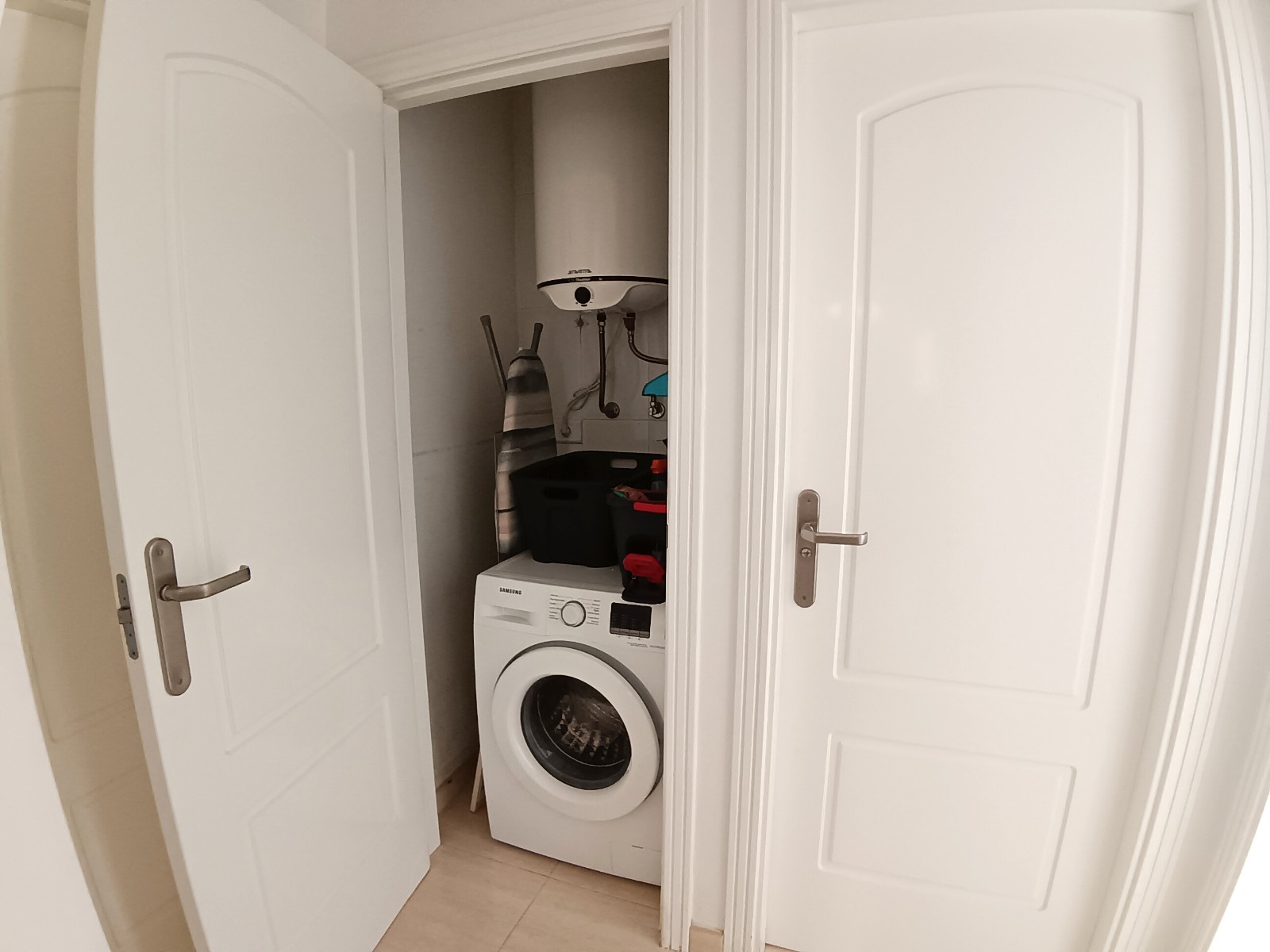 A marble staircase leads to the upper floor, where the master bedroom is located. This spacious room with fitted wardrobes benefits from an en-suite bathroom with bath, and has access to the roof terrace balcony with open views across the natural surroundings and towards the Montgó mountain range.