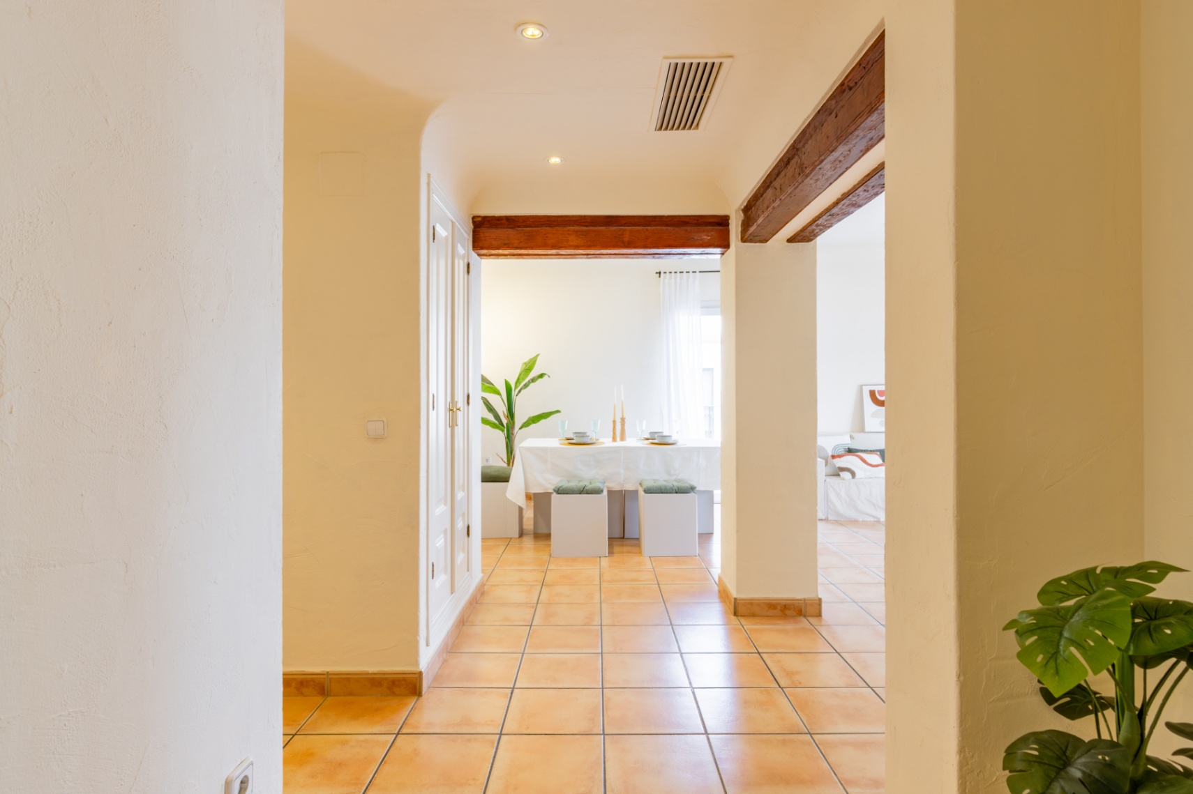 Upon entering, you are enveloped by the warmth of the walls dressed in rustic stucco and exposed wooden beams, providing that visual nobility of homes with soul. The large livingdining room opens to a terrace framed by traditional arches, the perfect place for morning coffee. From here, the experience is complete: you not only feel the tranquil pulse of the village but also enjoy side views of the sea, a constant reminder that the Mediterranean is just steps away.