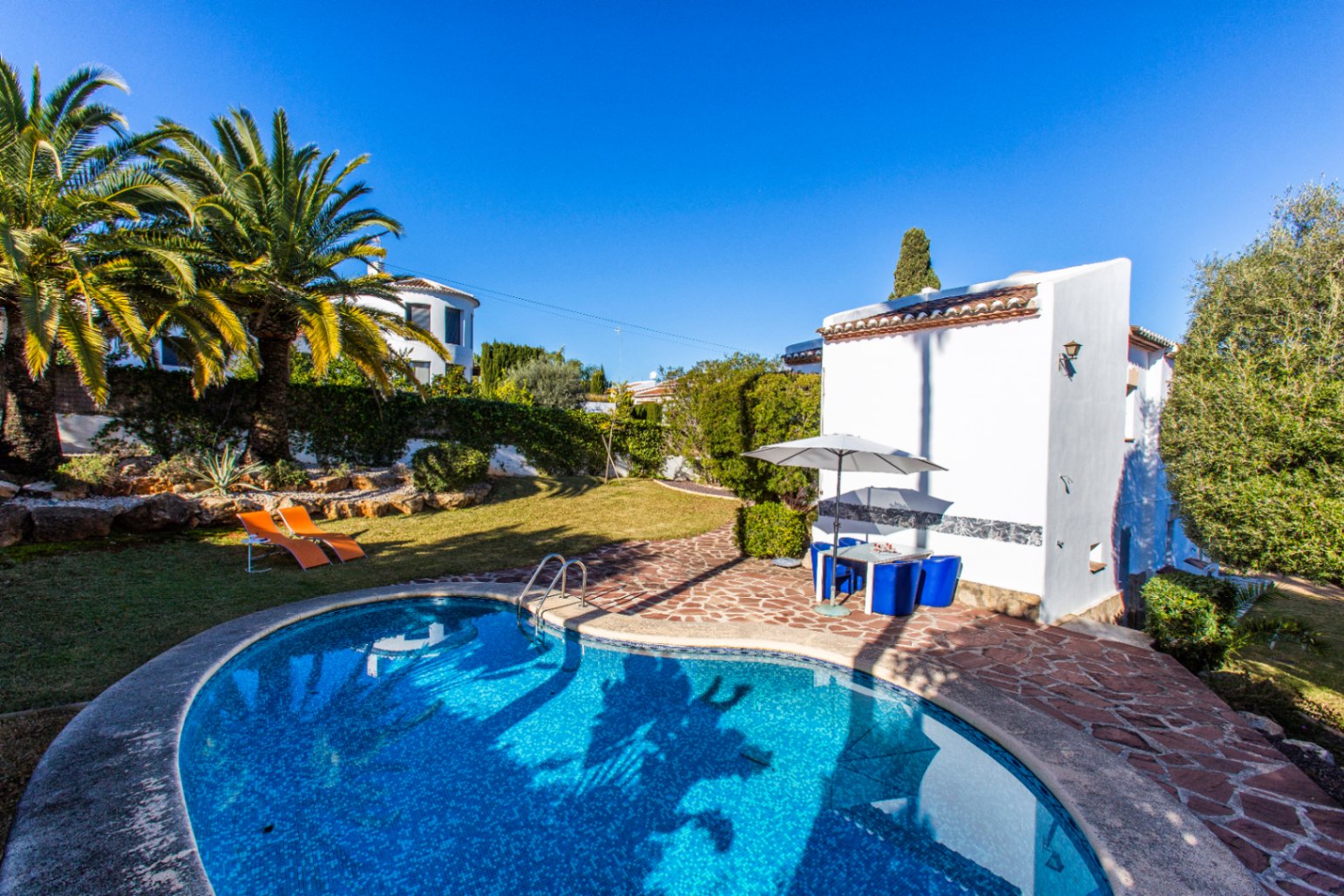 Villa for sale in Javea, Pinosol. Southfacing, flat plot, swimming pool, guest apartment, 5 minutes by car from Arenal beach. Ideal for living or holidays on the Costa Blanca.