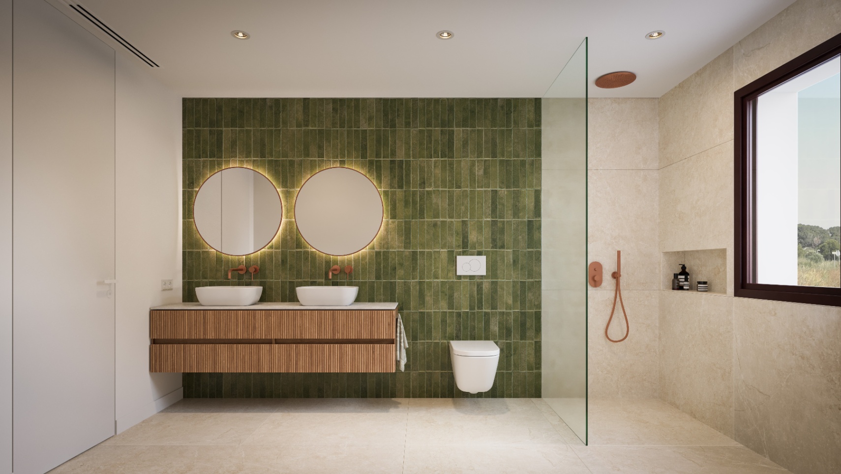 An internal staircase or lift leads to the upper floor with a spacious master bedroom with en-suite bathroom and private terrace, plus two additional bedrooms sharing a third bathroom.