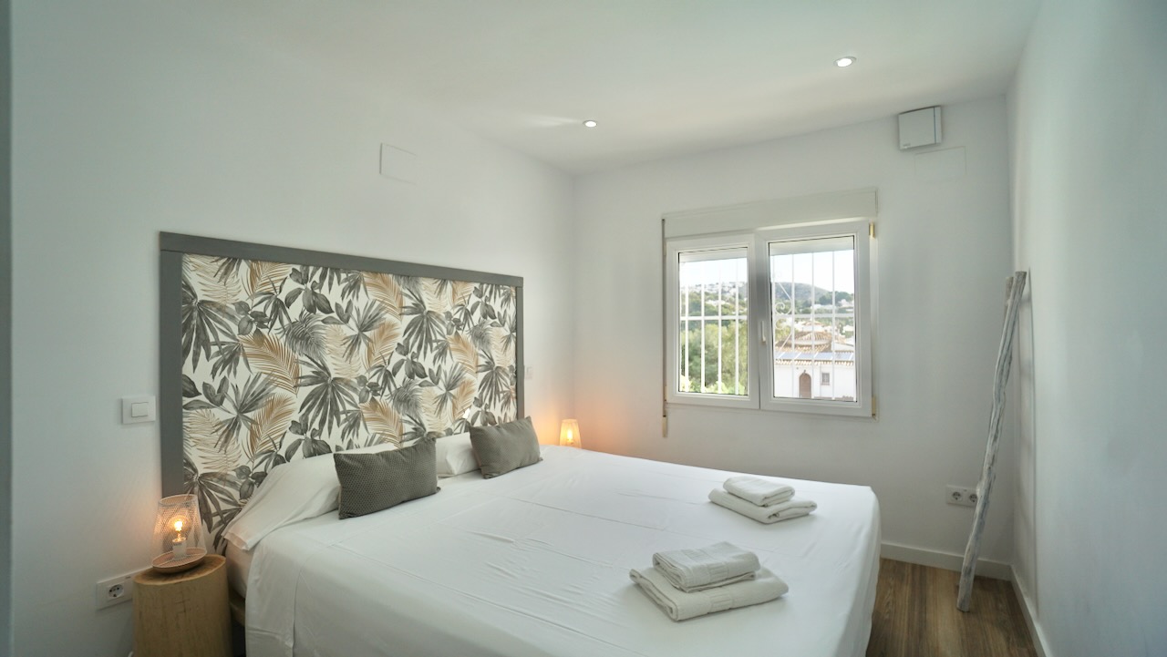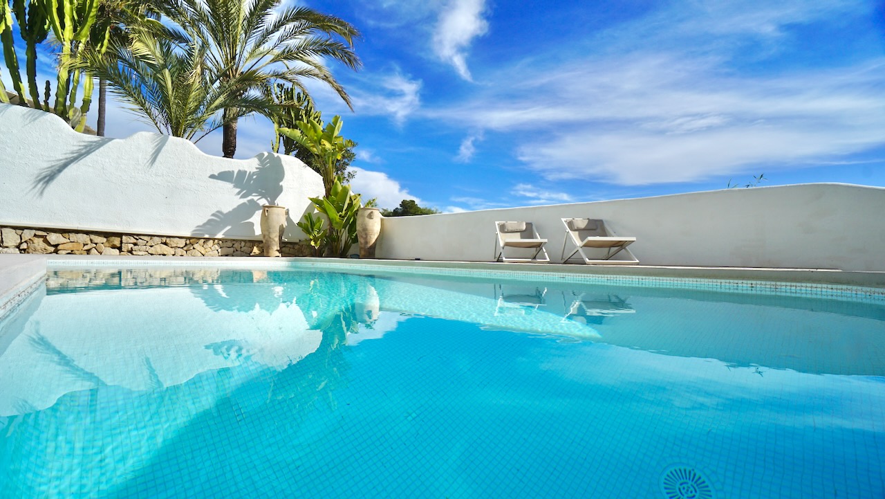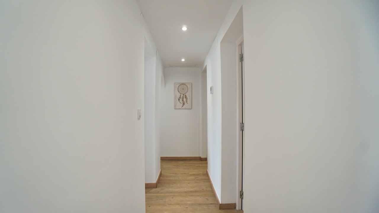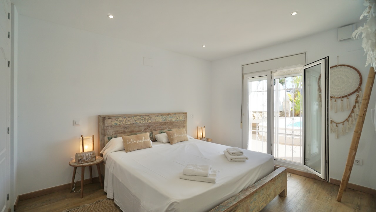 From the living area, a hallway leads to the sleeping area. Here youll find the first modern bathroom with shower and toilet. Continuing down the corridor you have three double bedrooms, all with built-in wardrobes and finished in a clean Ibiza-style with plenty of natural light. These bedrooms are served by a second modern bathroom, designed in the same contemporary style. The master bed room on this level features direct access to the swimming pool.