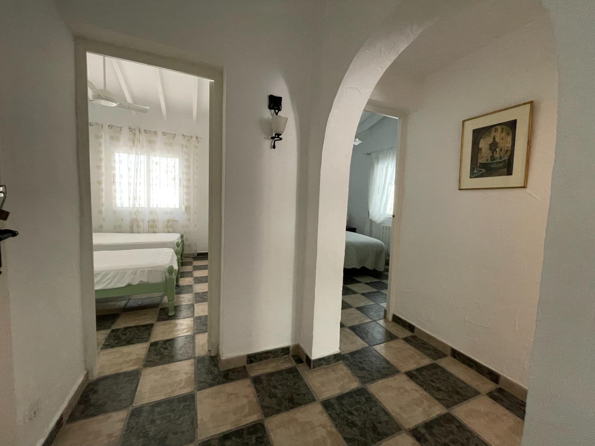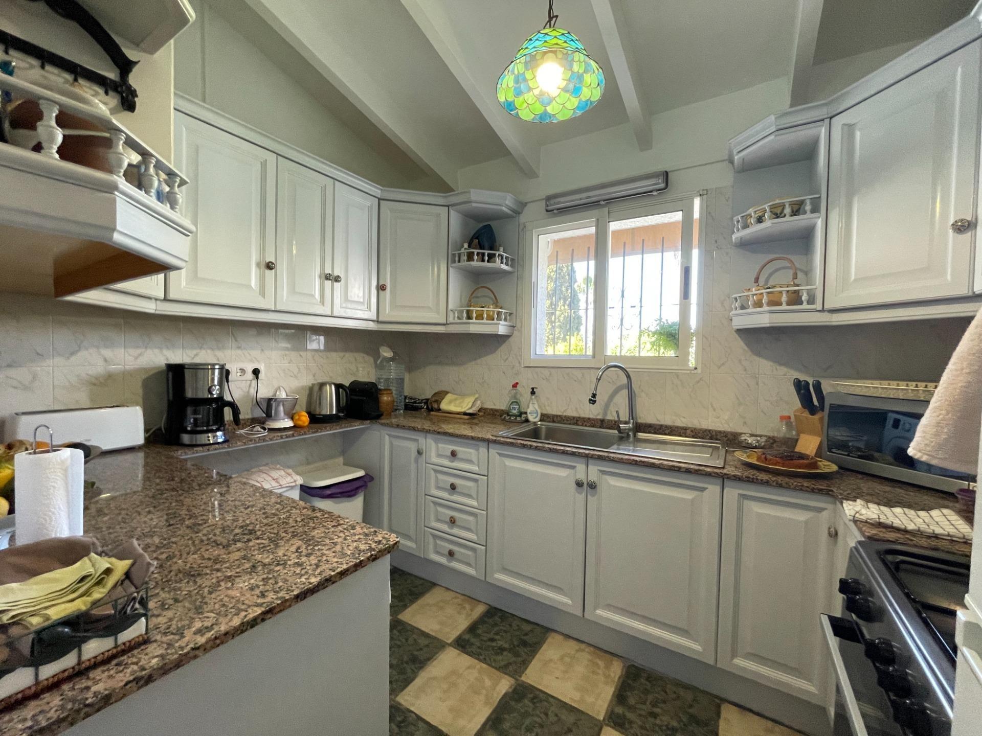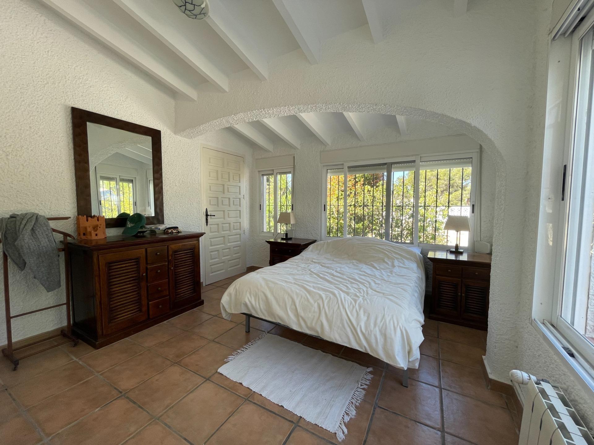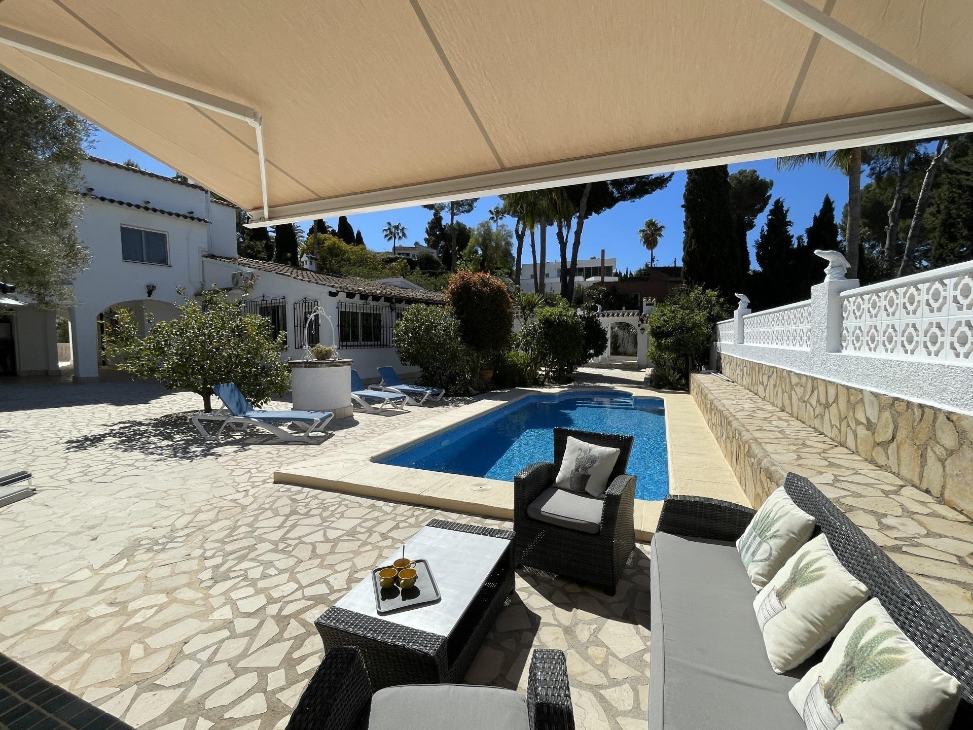 Charming villa for sale, within walking distance of Moraira village and El Portet beach, in Pla de Mar. Located in a prime spot, this home offers a classic rustic style, with a large, inviting patio shaded by trees, offering both sun and shade. It features a summer kitchen area and an outdoor BBQ, as well as an outdoor bathroom and shower next to the pool. The garden is well-established and maintained. The house comprises a living room with a separate kitchen and a bright, L-shaped dining room. Adjacent to the dining room is the master bedroom with its en-suite bathroom, and at the other end, a hallway leads to two bedrooms, a bathroom, and a storage room. From the dining room, a hallway at the far end houses a full bathroom with a shower and bathtub, and a staircase to an upstairs bedroom, which also provides access to the solarium with stunning views of the Bernia mountains. The property is accessed through large gates and includes a large garage and storage room. Furthermore, the villa is centrally heated by gas and has new air conditioning equipment. This is a fine Mediterranean-style home that must be viewed to fully appreciate its charm.