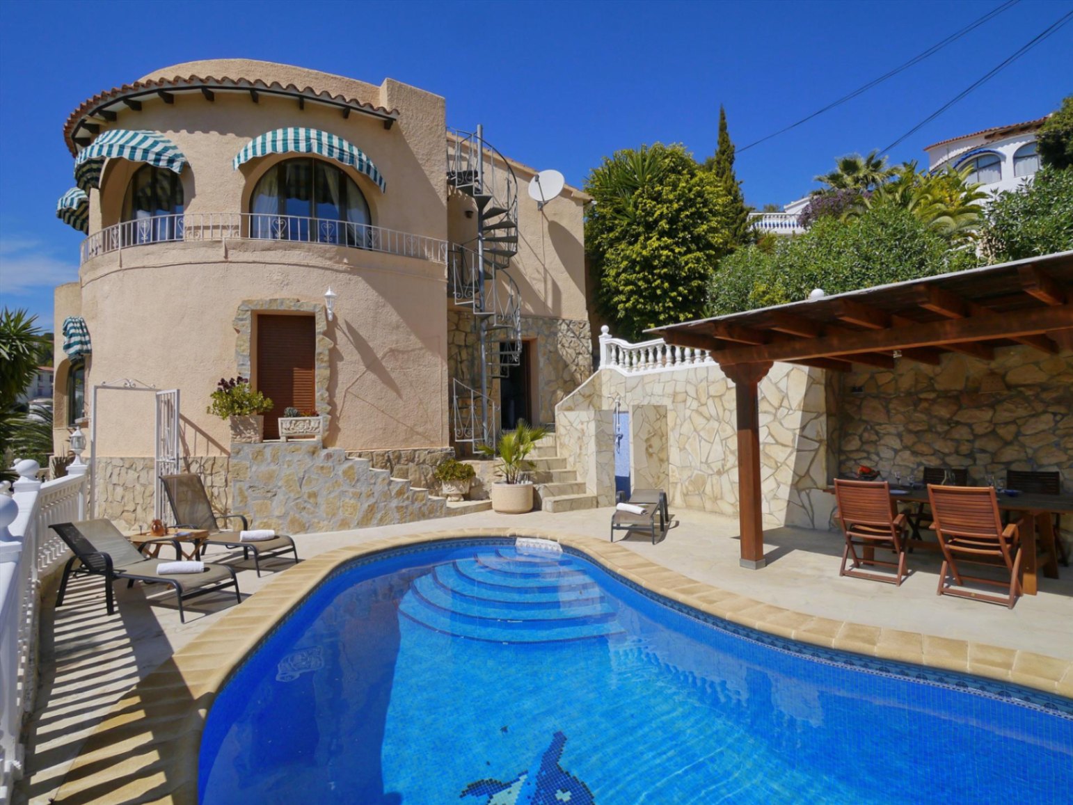 This charming villa with four bedrooms and private pool, is nestled slightly inland in Valle del Portet, Benitachell. A large supermarket and local shops are just a 2-minute drive away and the beach
