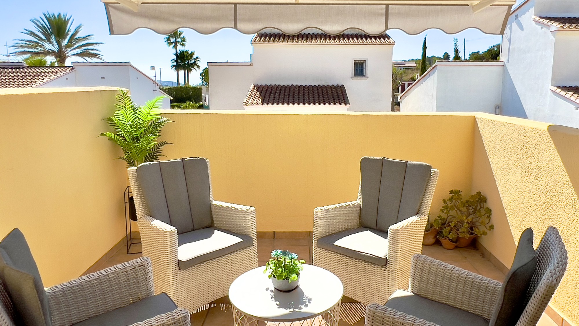 retiled rear terrace, which is private and low-maintenance, with planted