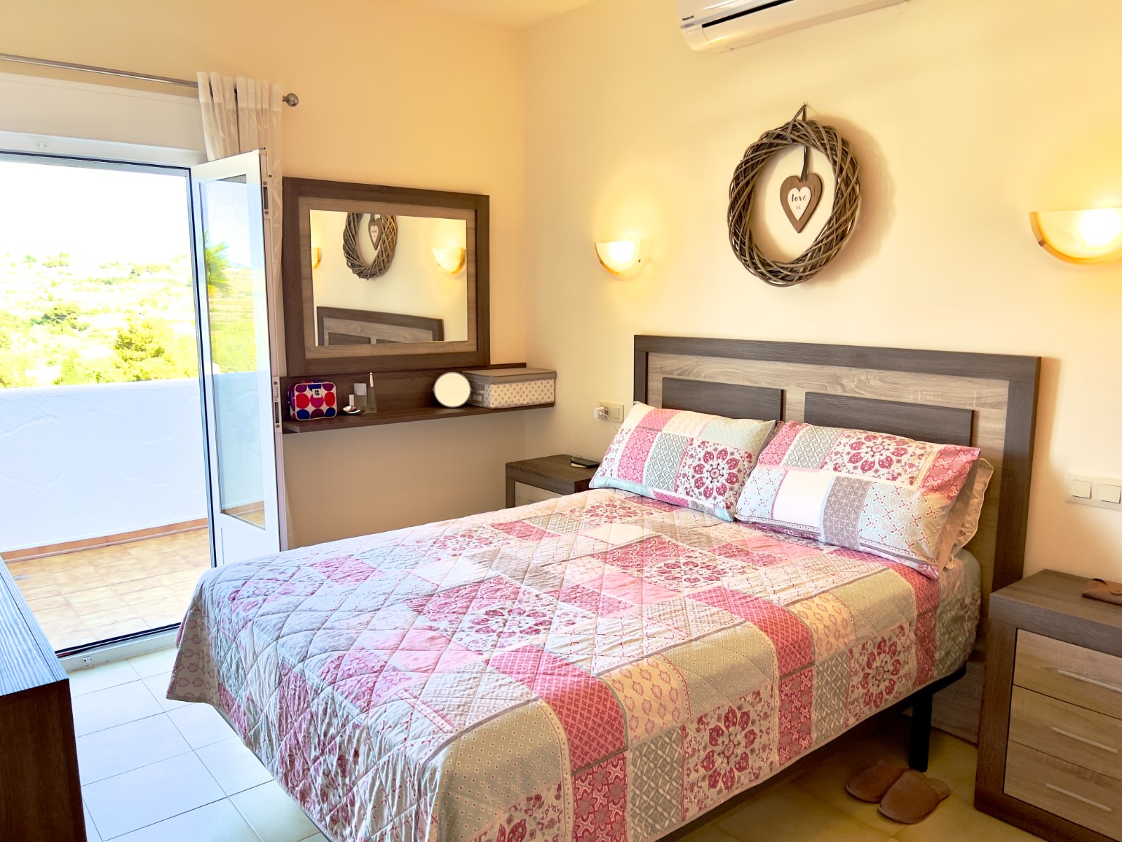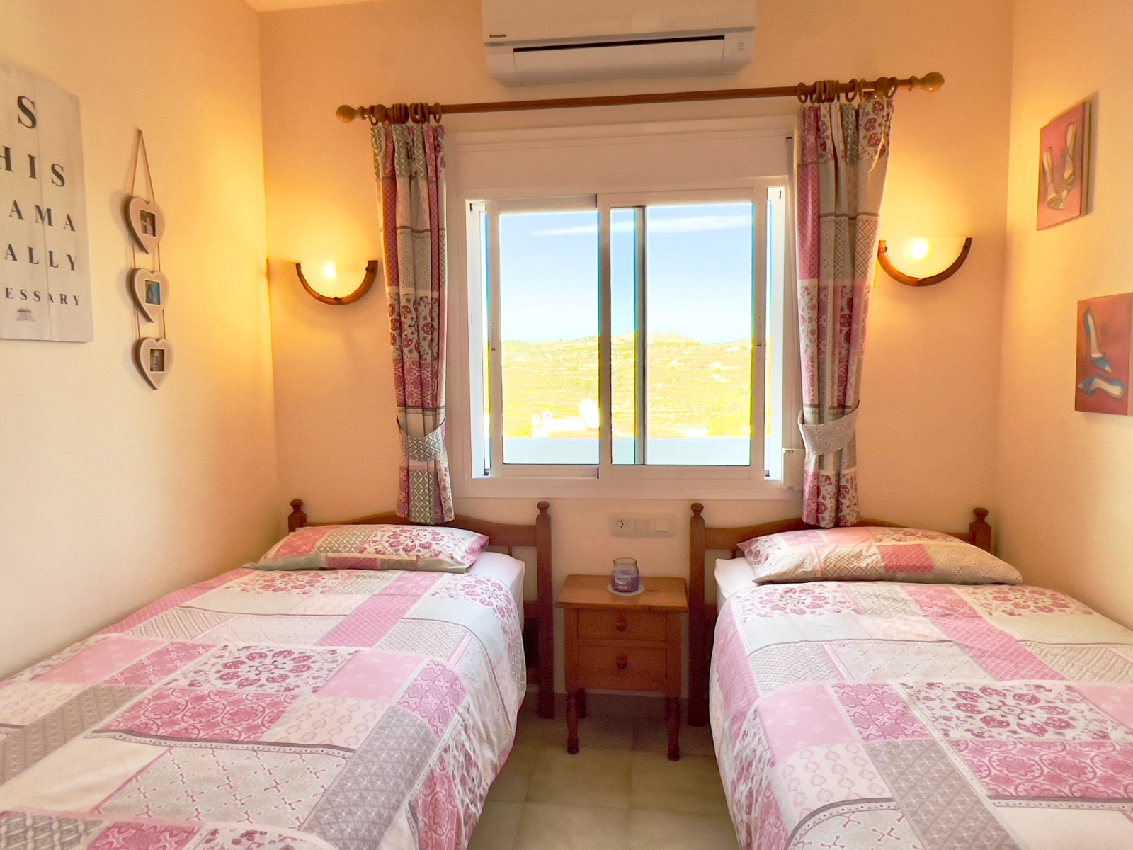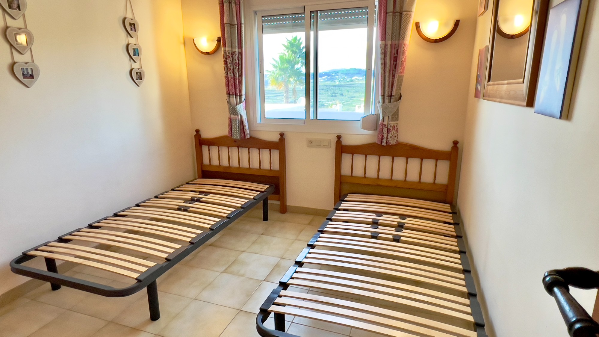 Along the hallway are two bedrooms. One is currently configured with twin beds and has a window overlooking the terrace, while the main bedroom enjoys direct access to the balcony through double doors, offering lovely valley views and a refreshing breeze. Both bedrooms are fitted with Castilian-style wardrobes as well as hot and cold air-conditioning.
