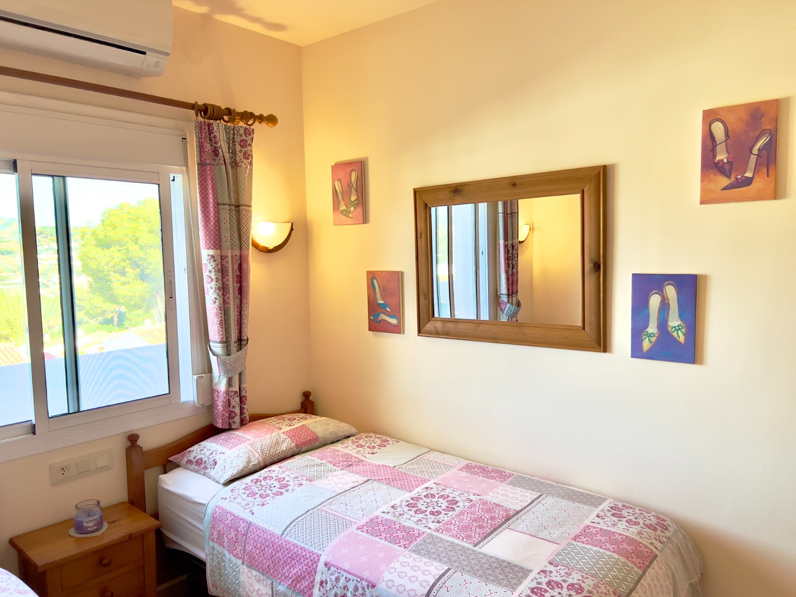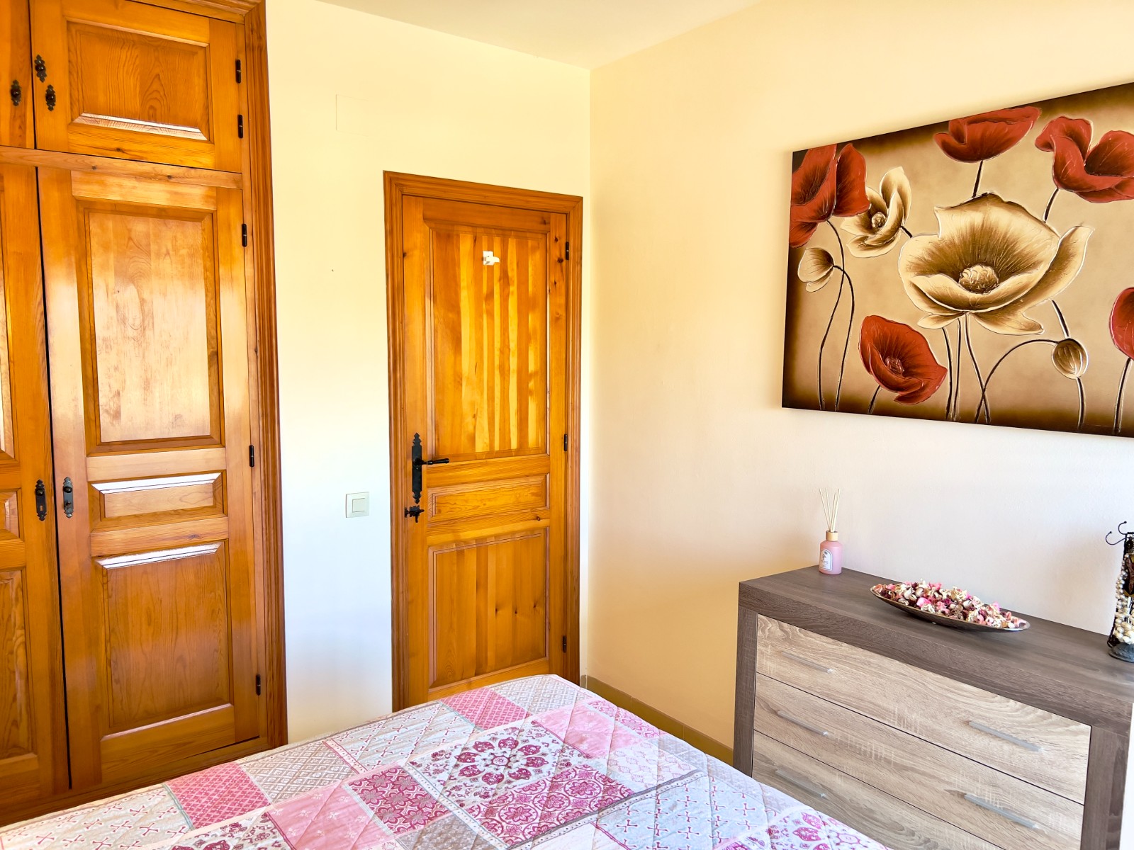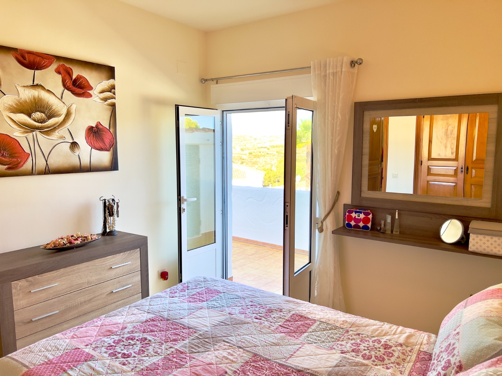 Along the hallway are two bedrooms. One is currently configured with twin beds and has a window overlooking the terrace, while the main bedroom enjoys direct access to the balcony through double doors, offering lovely valley views and a refreshing breeze. Both bedrooms are fitted with Castilian-style wardrobes as well as hot and cold air-conditioning.