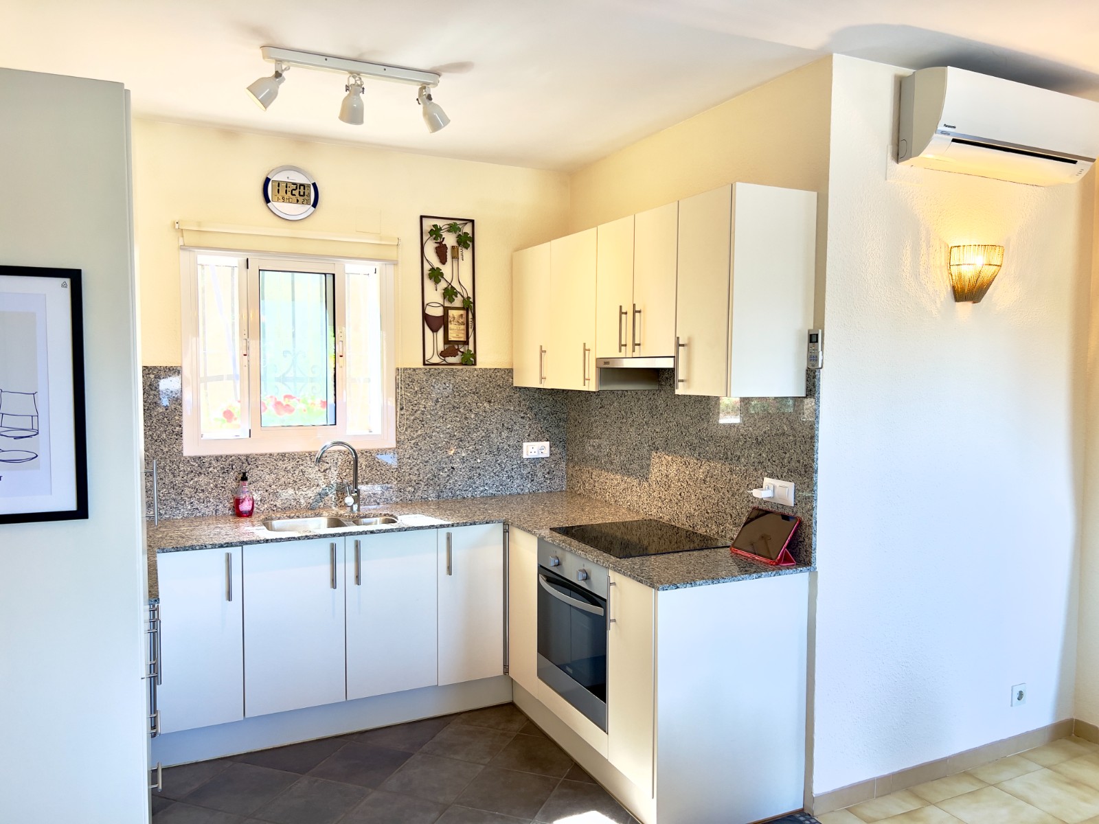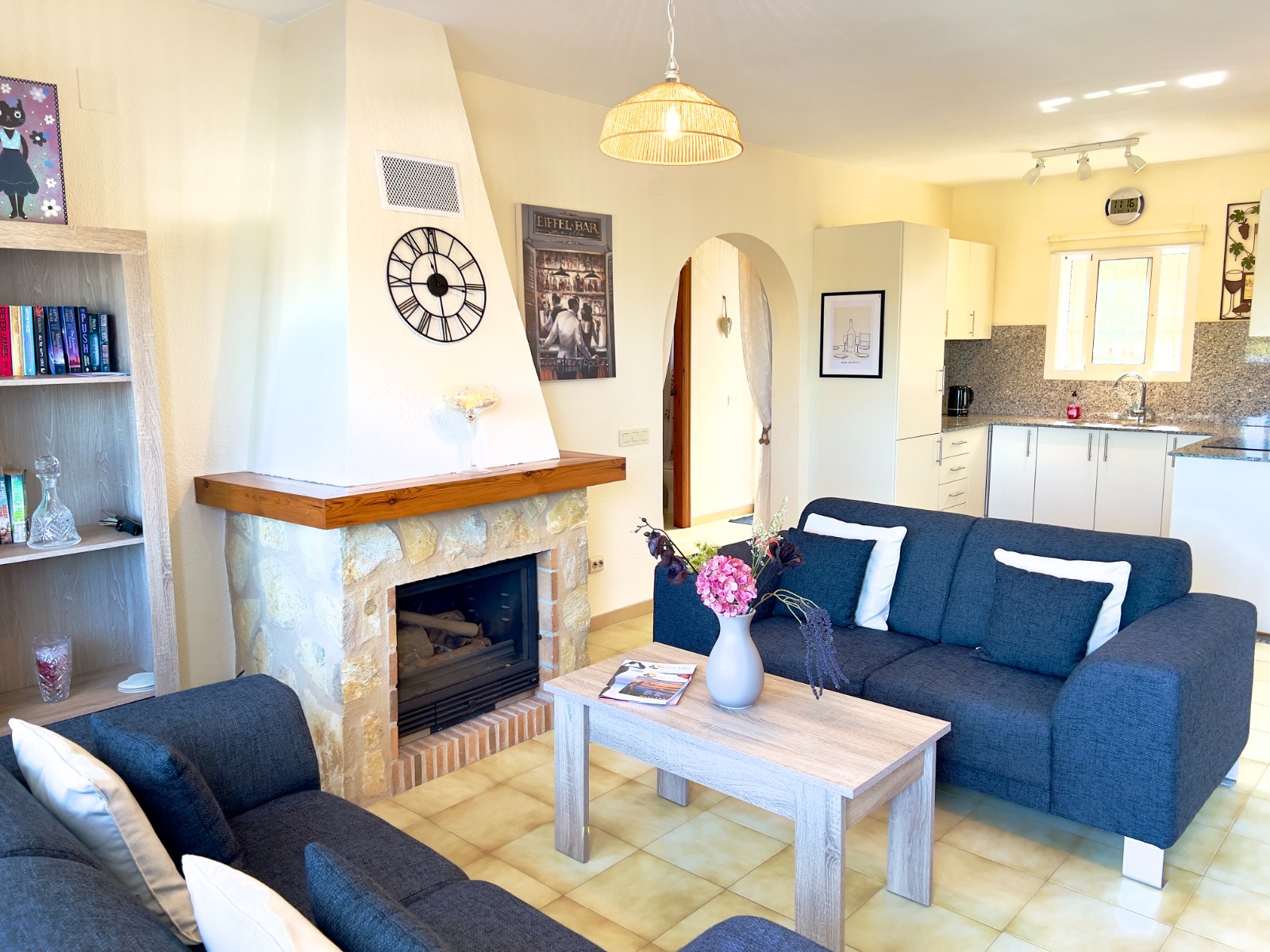 The bright and inviting lounge retains its traditional charm with a wood-burning stove set within the original fireplace for cosy winters, complemented by hot and cold air-conditioning for year-round comfort. From the lounge adoor opens directly onto the spacious balcony, perfect for enjoying the sunshine and open views.