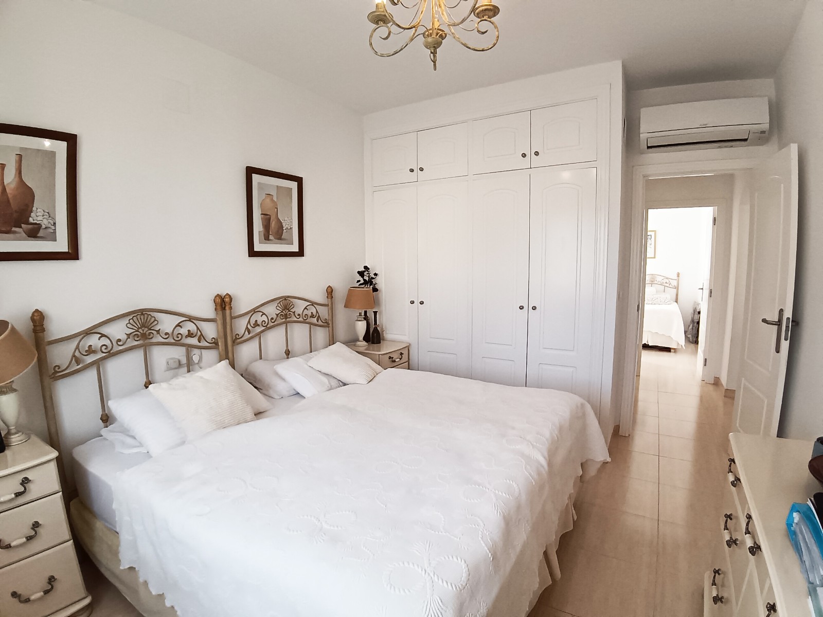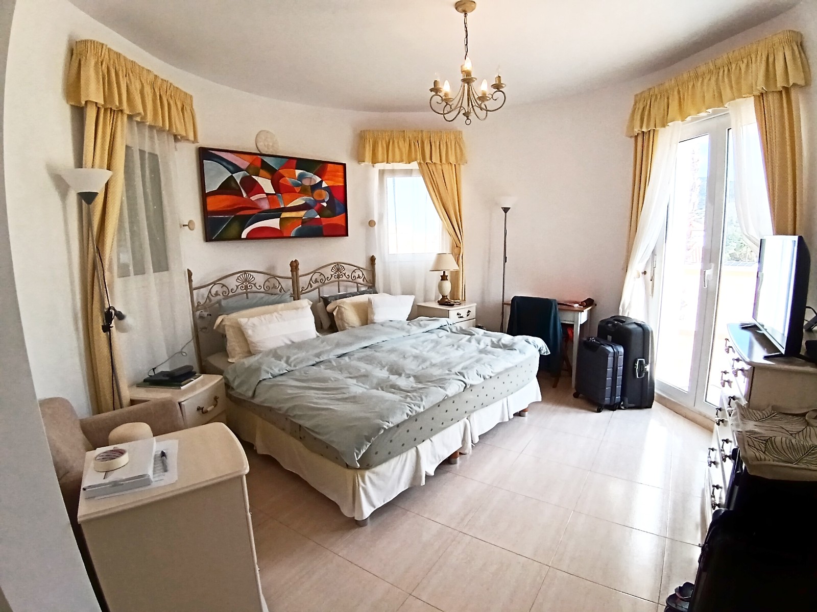 A marble staircase leads to the upper floor, where the master bedroom is located. This spacious room with fitted wardrobes benefits from an en-suite bathroom with bath, and has access to the roof terrace balcony with open views across the natural surroundings and towards the Montgó mountain range.