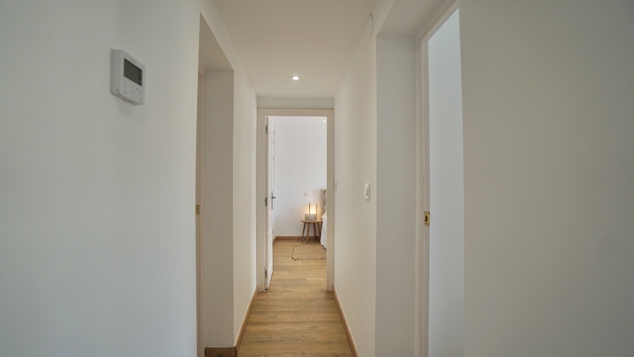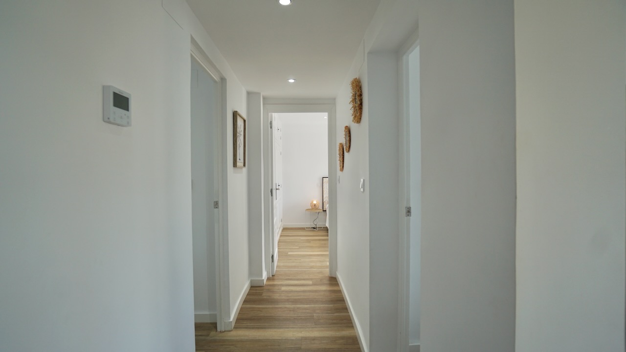 From the living area, a hallway leads to the sleeping area. Here youll find the first modern bathroom with shower and toilet. Continuing down the corridor you have three double bedrooms, all with built-in wardrobes and finished in a clean Ibiza-style with plenty of natural light. These bedrooms are served by a second modern bathroom, designed in the same contemporary style. The master bed room on this level features direct access to the swimming pool.