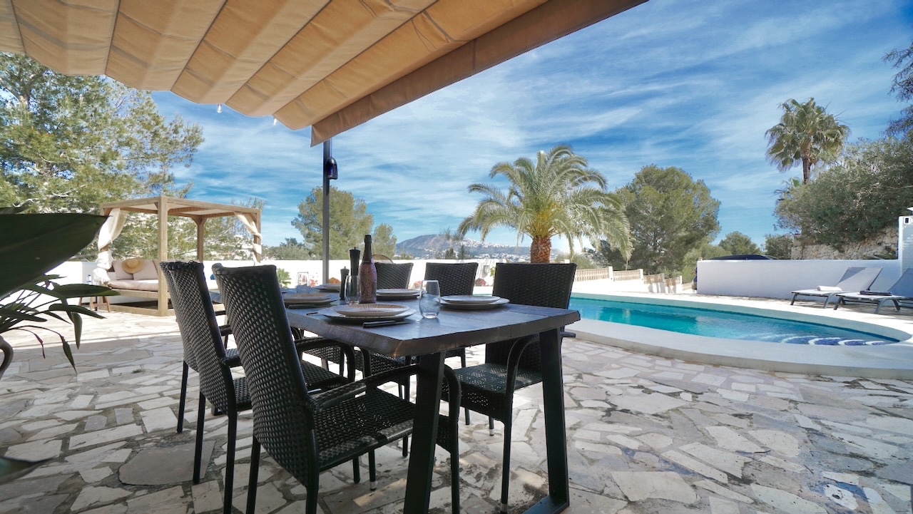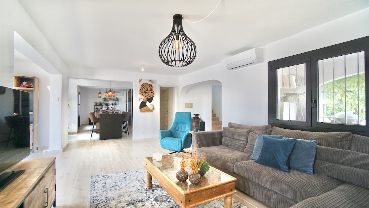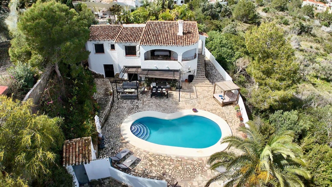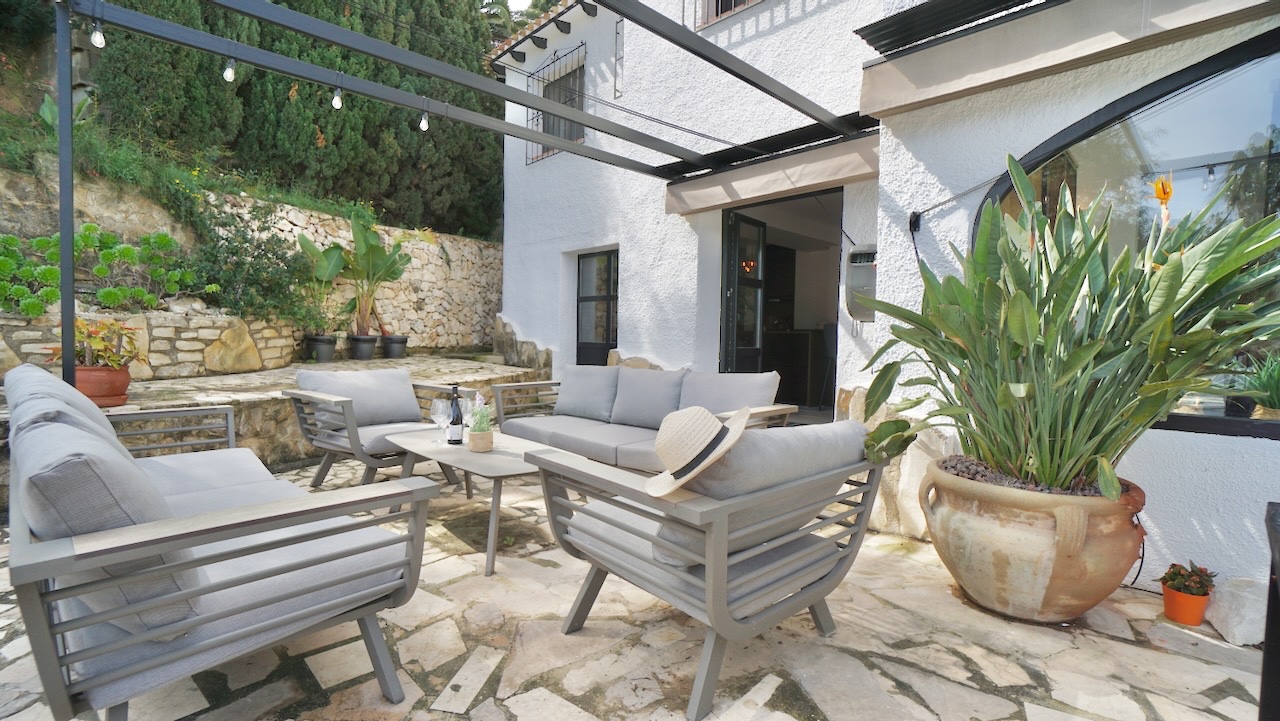 This charming traditional-style villa in Moraira was completely refurbished in 2023 and combines Mediterranean character with modern comfort. Set on a private plot of 1000 m², the property enjoys open views across the valley and a peaceful setting while still being conveniently close to the coast, beaches and the centre of Moraira.