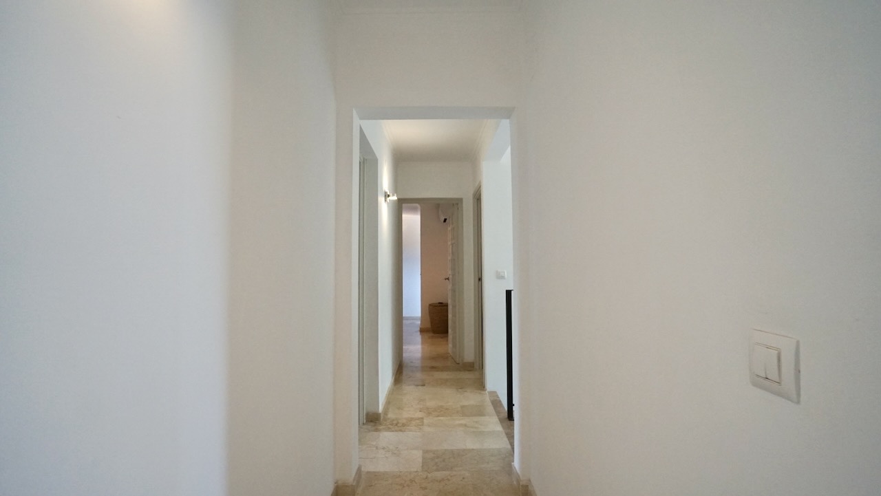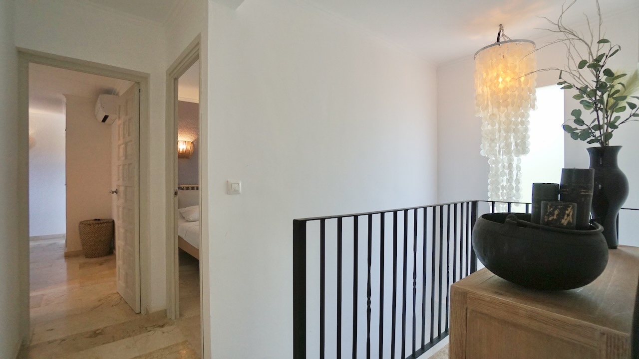 The villa features five bedrooms, two of which have en-suite bathrooms, as well as an additional bathroom, a guest toilet and a separate office space that could also be used as a study or hobby room. The master bedroom benefits from its own private balcony overlooking the surroundings. During the renovation the property was upgraded with new double-glazed windows, built-in wardrobes, air conditioning and practical storage areas.