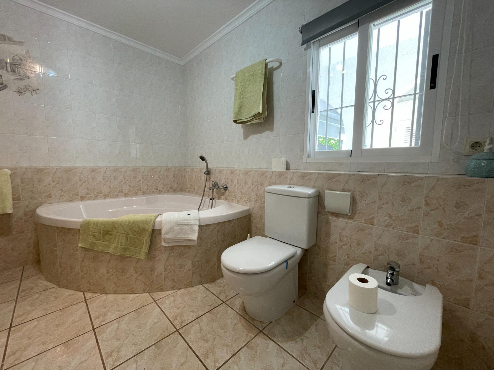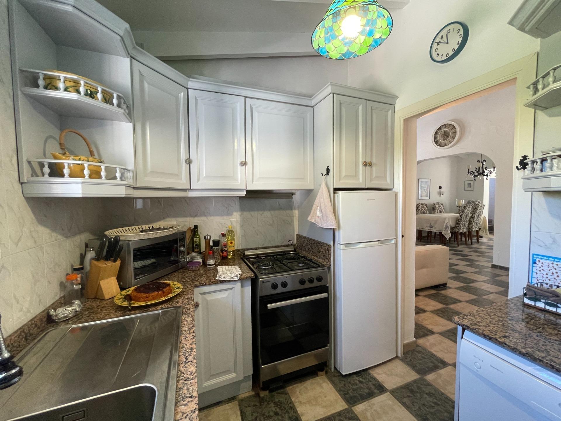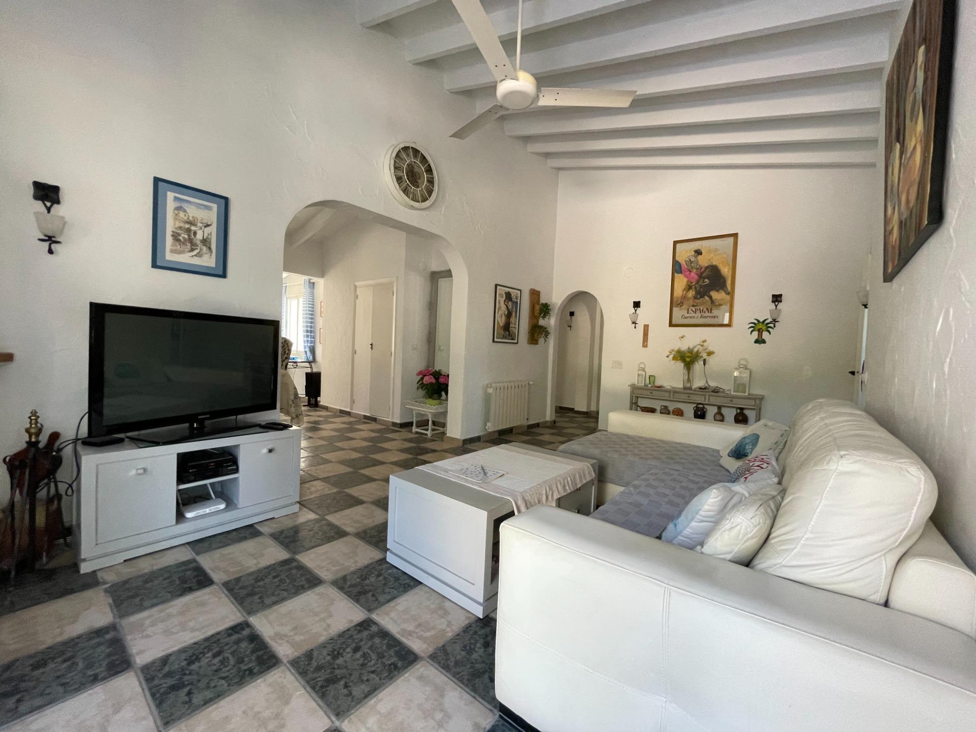 Charming villa for sale, within walking distance of Moraira village and El Portet beach, in Pla de Mar. Located in a prime spot, this home offers a classic rustic style, with a large, inviting patio shaded by trees, offering both sun and shade. It features a summer kitchen area and an outdoor BBQ, as well as an outdoor bathroom and shower next to the pool. The garden is well-established and maintained. The house comprises a living room with a separate kitchen and a bright, L-shaped dining room. Adjacent to the dining room is the master bedroom with its en-suite bathroom, and at the other end, a hallway leads to two bedrooms, a bathroom, and a storage room. From the dining room, a hallway at the far end houses a full bathroom with a shower and bathtub, and a staircase to an upstairs bedroom, which also provides access to the solarium with stunning views of the Bernia mountains. The property is accessed through large gates and includes a large garage and storage room. Furthermore, the villa is centrally heated by gas and has new air conditioning equipment. This is a fine Mediterranean-style home that must be viewed to fully appreciate its charm.